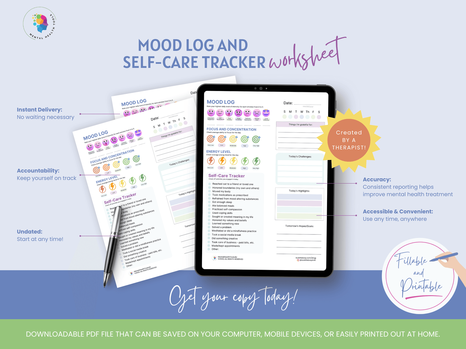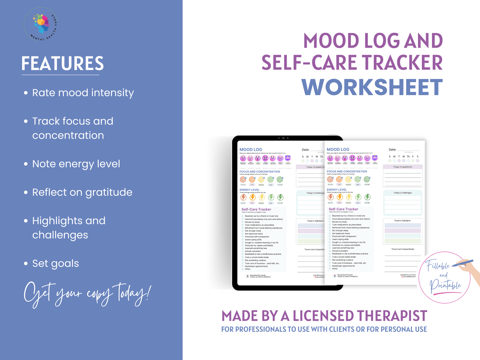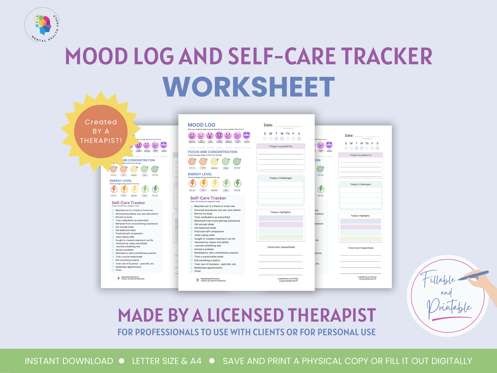 Please note that the printables offered from Mental Health Tools 4 U by Suzette Bray, are not a substitute or replacement for visiting a licensed therapist, nor are they an attempt at offering any sort of medical advice. A purchase of the printable does not constitute a therapist-client relationship.